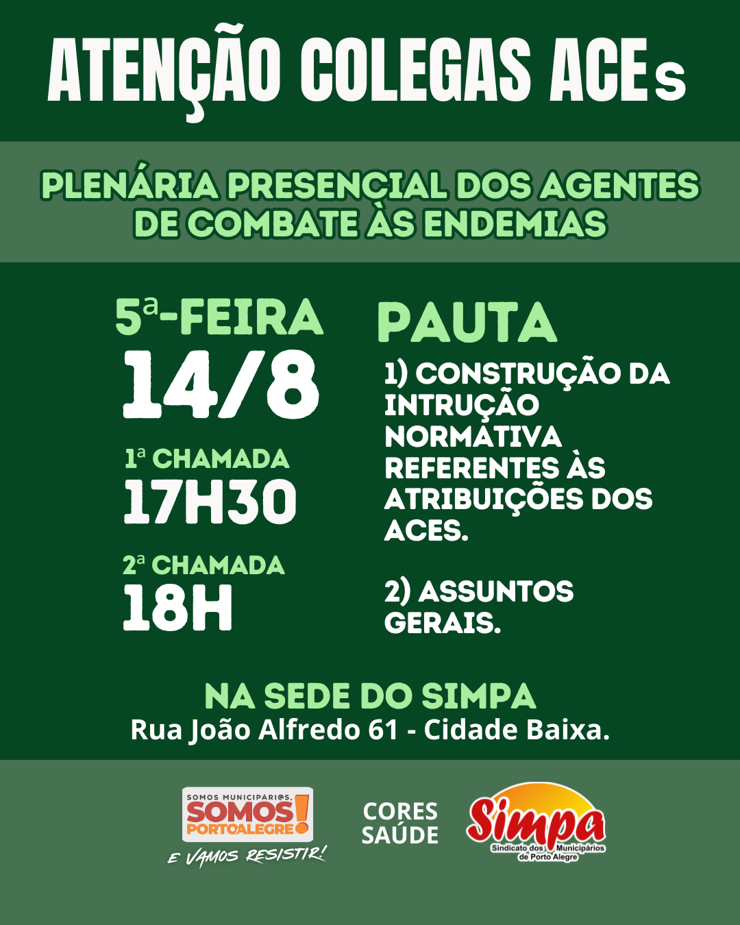 O Simpa e o Cores Saúde convocam os Agentes de Combate às Endemias (ACEs) para participarem da plenária presencial que acontece nesta quinta-feira, 14 de agosto, no sindicato. A primeira chamada será às 17h30 e a segunda chamada às 18h. Na pauta, está a construção da Instrução Normativa referente às atribuições dos ACEs e assuntos […]