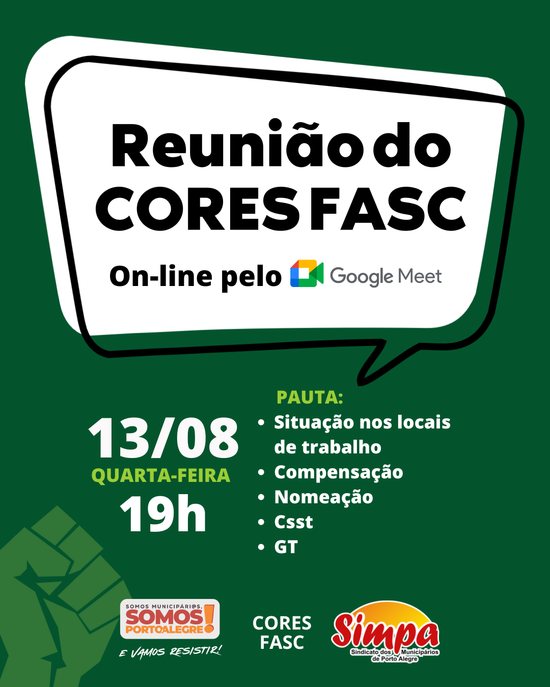 Na próxima quarta-feira, 13 de agosto, às 19h, acontece mais uma importante reunião do CORES FASC, que será online. Pauta: ✔ Situação nos locais de trabalho ✔ Compensação ✔ Nomeação já! ✔ CssT ✔ GT A tua presença é fundamental para fortalecer nossa luta coletiva! ✊ Vem com a gente! Somos […]
