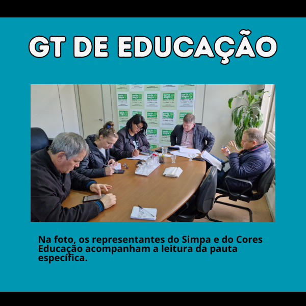 O Grupo de Trabalho da Educação (GT Educação), composto pelo Sindicato dos Municipários de Porto Alegre (Simpa), pelo Cores Educação e por representantes do governo, retomou as negociações da pauta específica da educação, referente à data-base, durante reunião com a presença de representantes da Secretaria Municipal de Administração e Patrimônio (SMAP) e da Secretaria Municipal […]