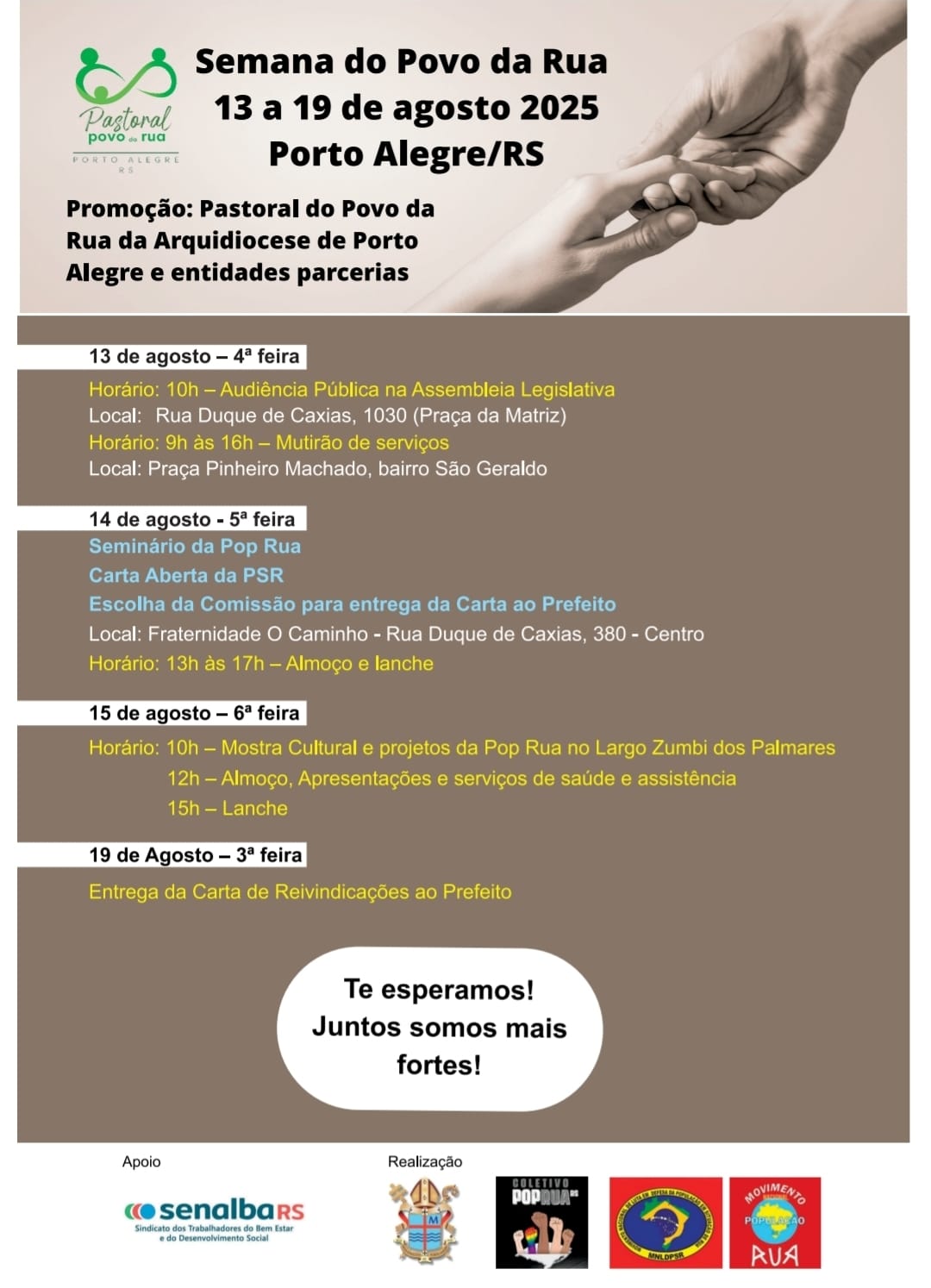 A Semana do Povo da Rua é uma iniciativa promovida pela Pastoral do Povo da Rua da Arquidiocese de Porto Alegre e entidades parceiras. O evento, que iniciou no dia 13 e se estende até a terça-feira, dia 19 de agosto, tem como objetivo fortalecer a luta por direitos e dar visibilidade às demandas da […]