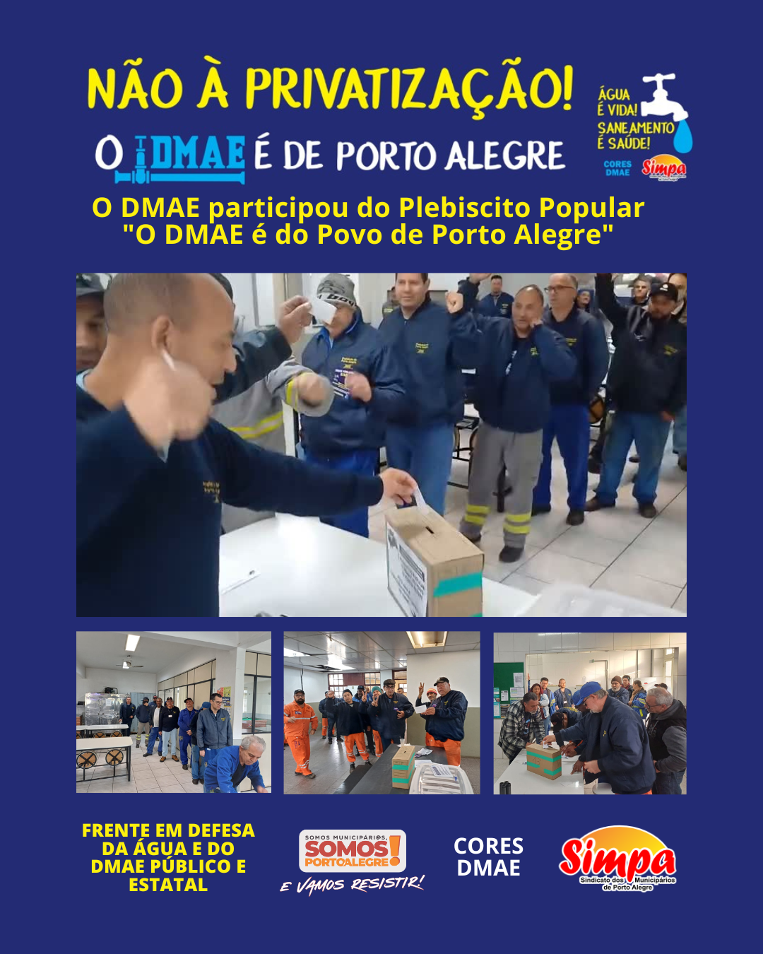 Vamos juntos dizer não à privatização do DMAE! Participe do plebiscito popular “O DMAE é do povo de Porto Alegre”! O plebiscito também está disponível online, pelo link: https://simpa.org.br/plebiscitodmae/ A Frente em Defesa da Água e do DMAE Público e Estatal convoca todas e todos que defendem o acesso universal à água e o DMAE […]