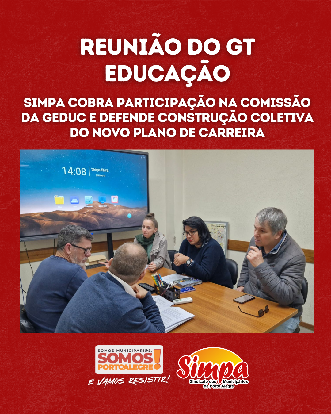 O Grupo de Trabalho da Educação (GT Educação), composto pelo Sindicato dos Municipários de Porto Alegre (Simpa), pelo Cores Educação e por representantes do governo, retomou as negociações da pauta específica da educação, referente à data-base, durante reunião com a presença de representantes da SMED e da SGG, na tarde desta terça-feira (12/8). Os […]