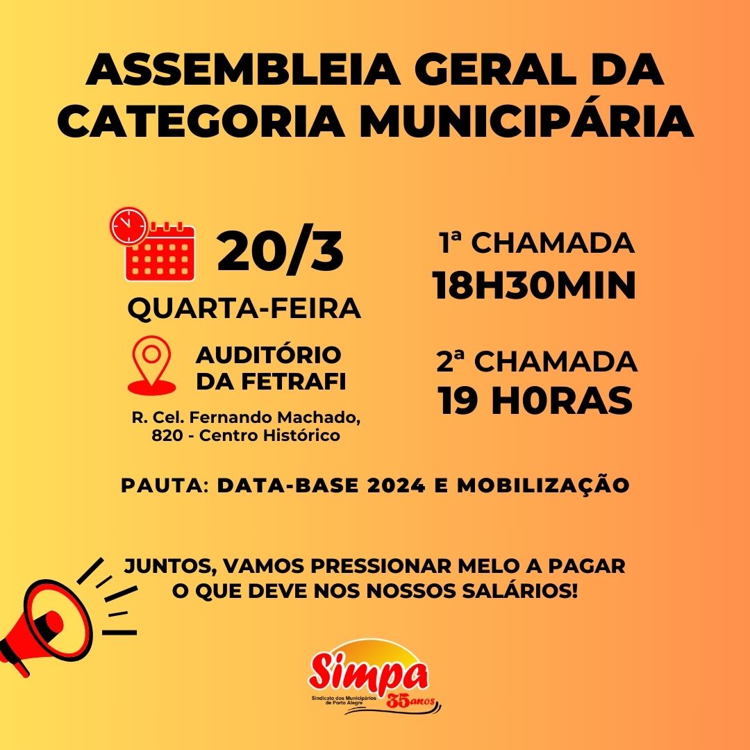 A Assembleia Geral sobre a Data-Base 2024, convocada pelo Sindicato dos Municipários de Porto Alegre (Simpa) e realizada no auditório da Fetrafi-RS, em Porto Alegre, na noite de quarta-feira (20/3), decidiu intensificar as mobilizações para pressionar o governo Melo a responder à pauta de reivindicações. ⬇️ DESRESPEITO DE MELO COM A CATEGORIA MUNICIPÁRIA […]