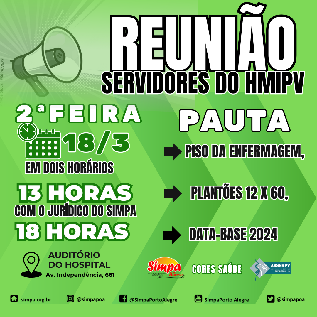 Na próxima segunda-feira (18/03) teremos reunião em dois horários no auditório do Hospital Materno Infantil Presidente Vargas (HMIPV), às 13h (com a presença do Jurídico do Simpa) e às 18h. Os temas da pauta são: Piso da Enfermagem, os Plantões 12×60 e a Data-Base 2024. Tua presença é muito importante. Juntos e juntas podemos avançar! […]