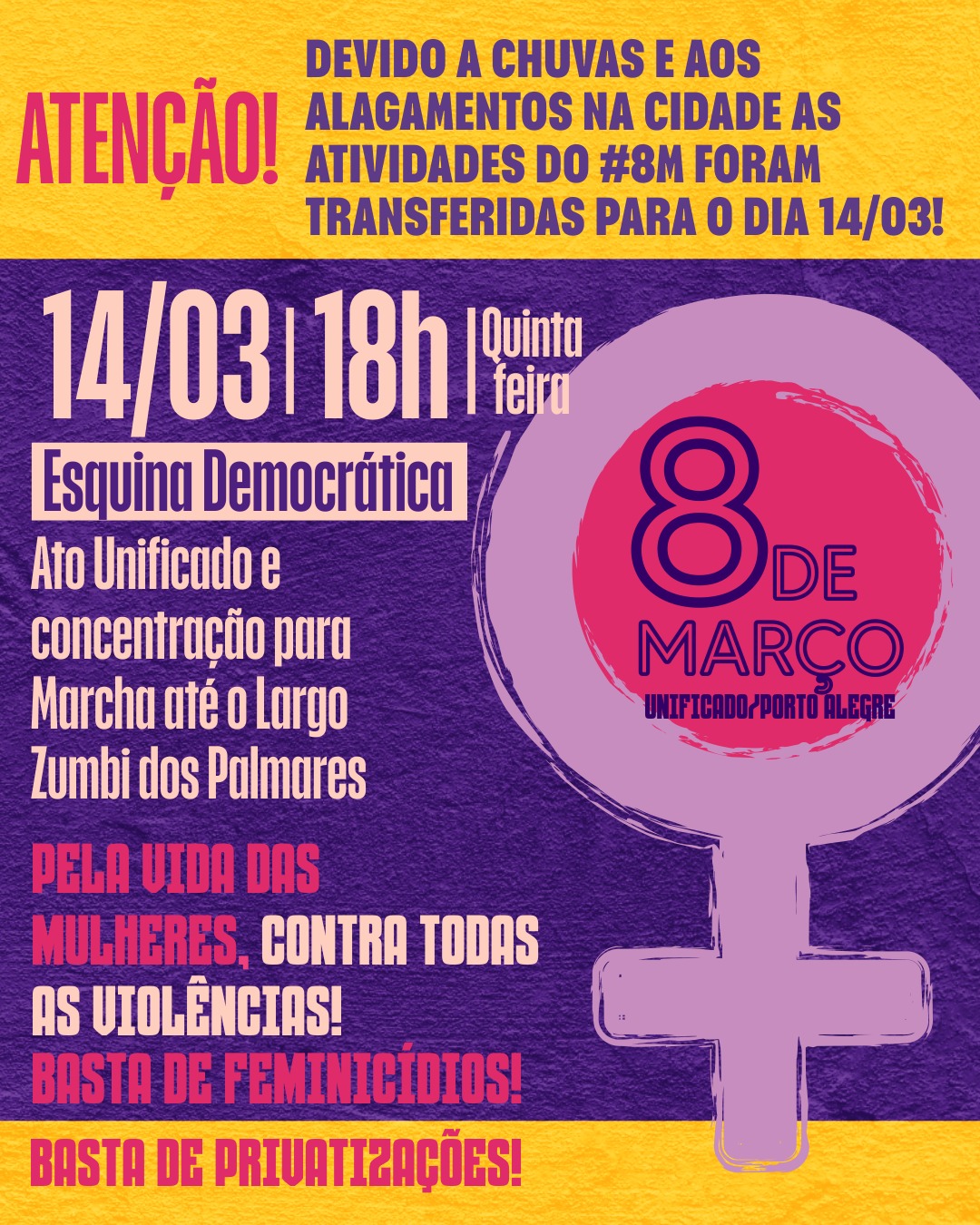 Devido às chuvas e aos alagamentos, o Ato Unificado e a Marcha do #8M foram transferidos para a próxima quinta-feira, dia 14 de março. A concentração para o Ato será na Esquina Democrática, a partir das 18h, com a Marcha até o Largo Zumbi de Palmares. PELA VIDA DAS MULHERES, CONTRA TODAS AS VIOLÊNCIAS! BASTA […]