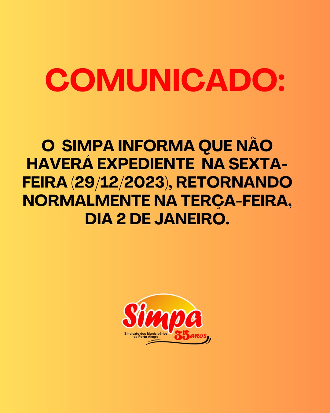 O Simpa informa que não haverá expediente na sexta-feira (29/12/2023), retornando normalmente na terça-feira, 2 de janeiro de 2024. Tags: municipários, poa, Porto alegre, serviçopúblico, Servidores, simpa, sindicato