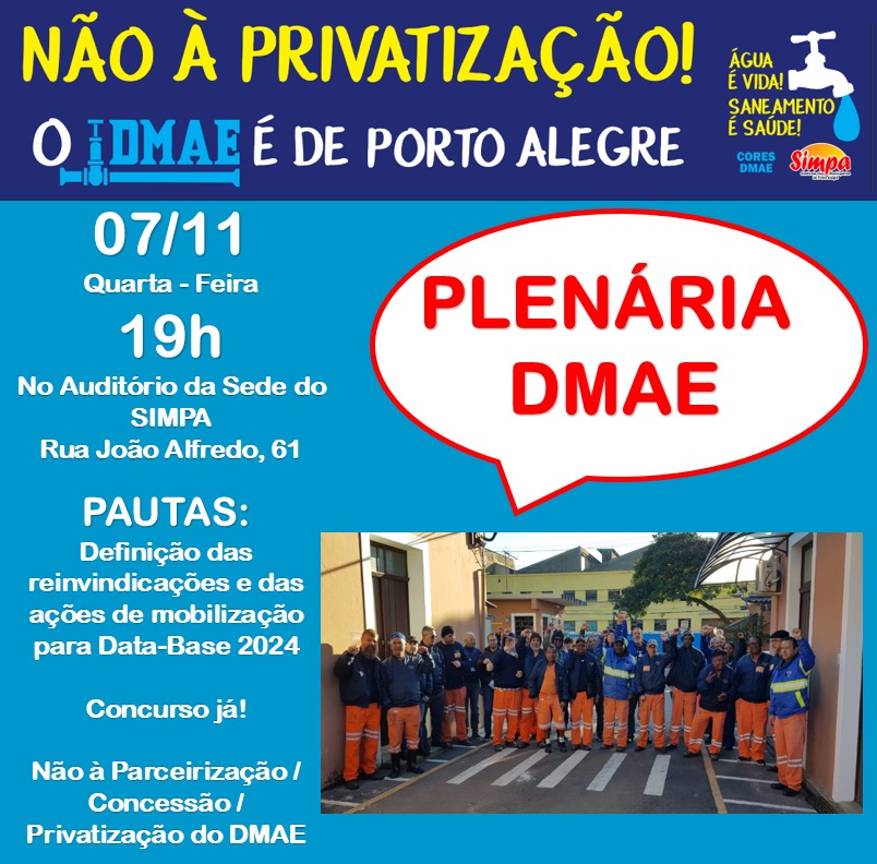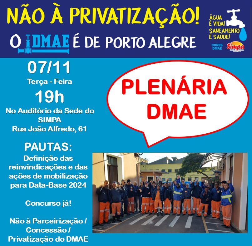 Dia 07/11, Terça-feira das 19:00 às 20:30 horas, no Auditório da sede do SIMPA na Rua João Alfredo, 61 Pautas: ➡️Definição das reinvindicações e das ações de mobilização para Data-base 2024 ➡️Concurso Já! ➡️Não à Parcerização/Concessão/Privatização do DMAE Colega do DMAE, sua participação e mobilização são muito importantes na luta por salário digno e condições […]