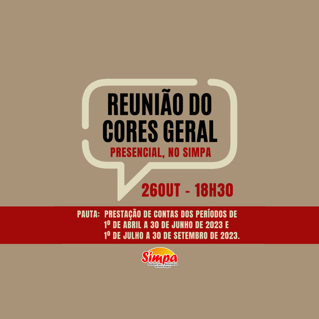 Na próxima quinta-feira, dia 26 de outubro, será realizada reunião do Cores Geral, no formato presencial, a partir das 18h30min, no auditório do Sindicato dos Municipários de Porto Alegre (Simpa). A reunião do Cores Geral terá como pauta a Prestação de Contas dos períodos de 1º de abril a 30 de junho de 2023 e […]
