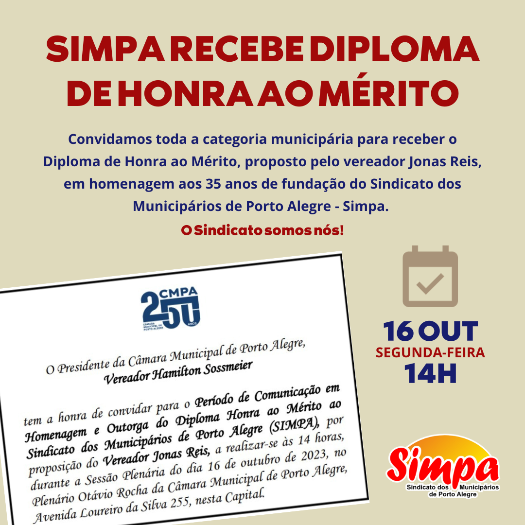 Convidamos toda a categoria municipária para receber o Diploma de Honra ao Mérito, proposto pelo vereador Jonas Reis, em homenagem aos 35 anos de fundação do Sindicato dos Municipários de Porto Alegre – Simpa. O Sindicato somos nós! 📍 Dia 16 de outubro de 2023, às 14h, no Plenário da Câmara. (Av. Loureiro da Silva, […]