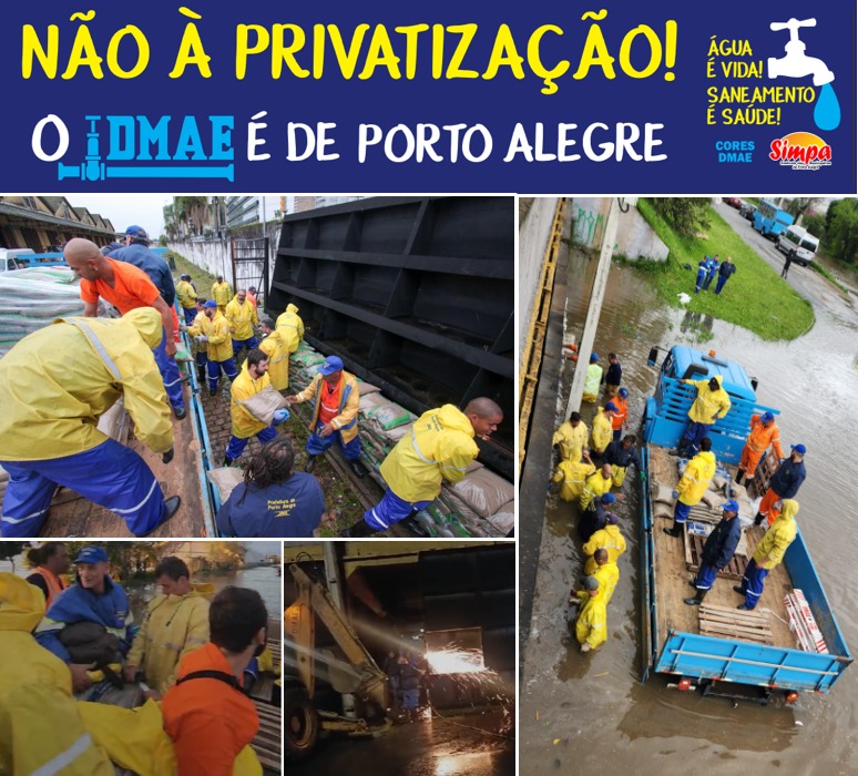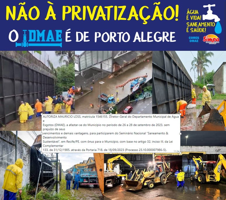 Enquanto a cidade sofre com a inundação, os servidores do DMAE público trabalham há vários dias tentando minimizar os efeitos das cheias, demonstrando o quanto o DMAE é essencial para todos, principalmente num momento tão difícil como este. Enquanto isso, na hora em que a cidade mais precisa, o Diretor do DMAE, o mesmo que apoia […]