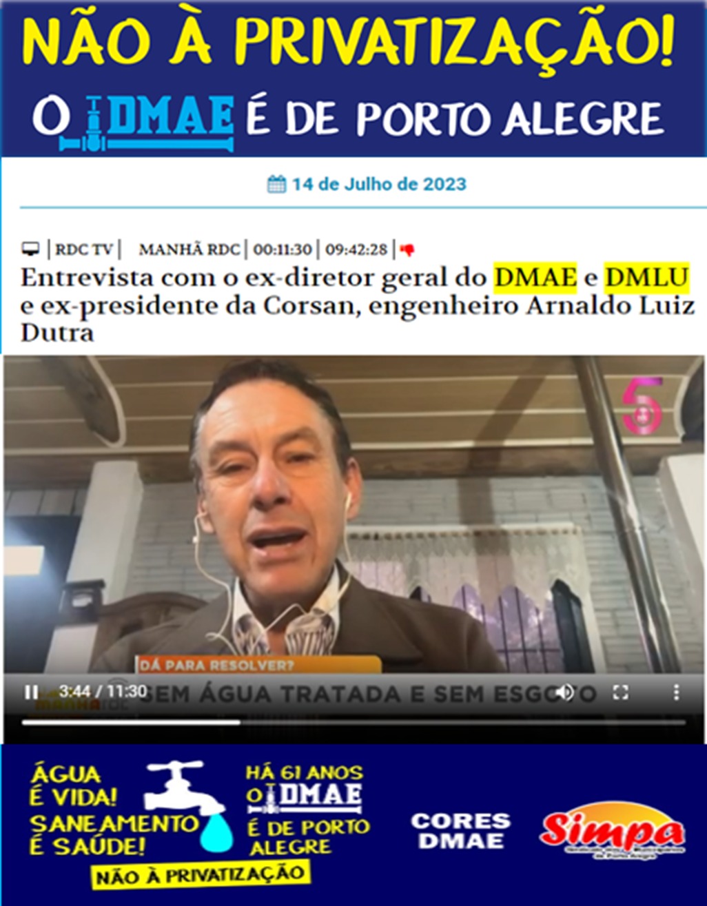 Na quinta-feira, dia 13/07 ,o ex-diretor do Departamento Municipal de Água e Esgoto, o engenheiro Arnaldo Dutra concedeu entrevista à RDC TV no Programa “Manhã RDC” sobre saneamento básico e sobre a privatização do DMAE. Na entrevista, o ex-diretor diz que é contrário à privatização e defende que a autarquia já foi referência nacional e […]