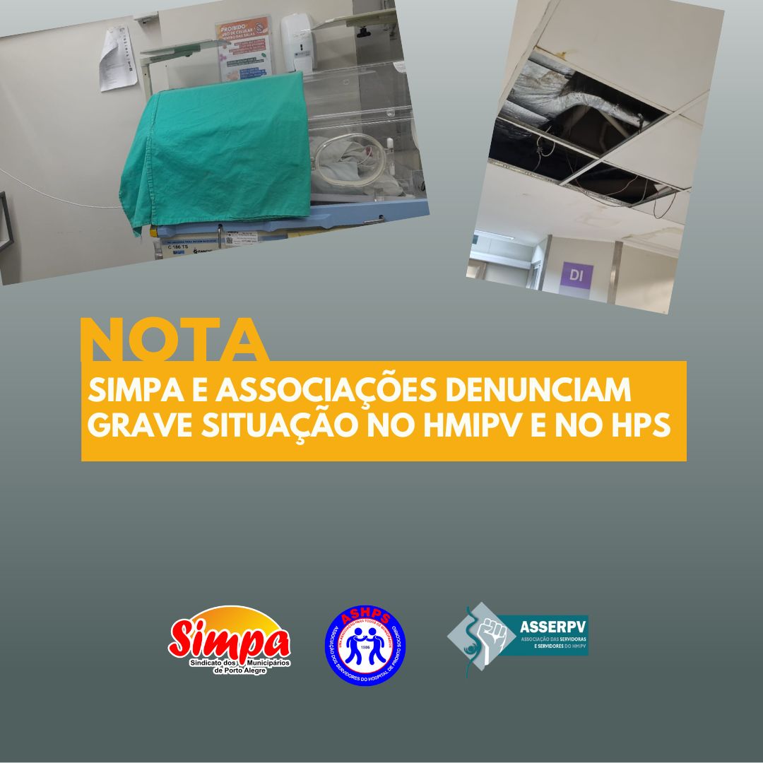 O Sindicato dos Municipários de Porto Alegre – Simpa, a Associação dos Servidores do Hospital Materno-Infantil Presidente Vargas – Asserpv e a Associação dos Servidores do Hospital de Pronto Socorro de Porto Alegre – Ashps denunciam situação dos hospitais municipais durante chuvas iniciadas na quinta-feira (15). No Hospital Materno-Infantil Presidente Vargas (HMIPV), as chuvas provocaram […]