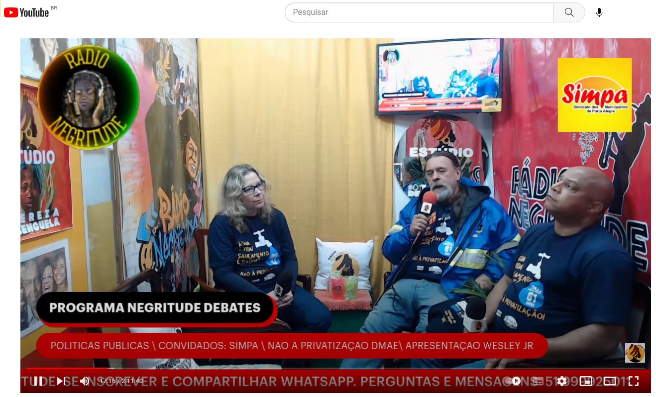 O diretor do Sindicato dos Municipários de Porto Alegre (Simpa) Edson Zomar e os representantes do Cores DMAE Sandra Daruí e Jefferson Machado participaram do programa Negritude Debates da Rádio Negritude na manhã desta sexta-feira (16). O programa conduzido pelo apresentador Wesley Jr. durou 2 horas e teve como pauta “não à privatização do DMAE”. […]