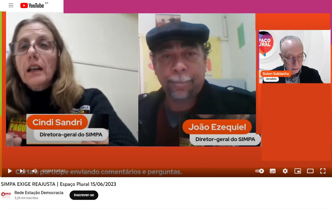 Os diretores gerais do Sindicato dos Municipários de Porto Alegre (Simpa), Cindi Sandri e João Ezequiel, participaram na quinta-feira (15) do programa Espaço Plural da Rede Estação Democracia – RED que teve como tema “Simpa exige reajuste”. Durante a entrevista, os representantes dos municipários falaram sobre a rejeição da categoria ao índice apresentado por Melo […]