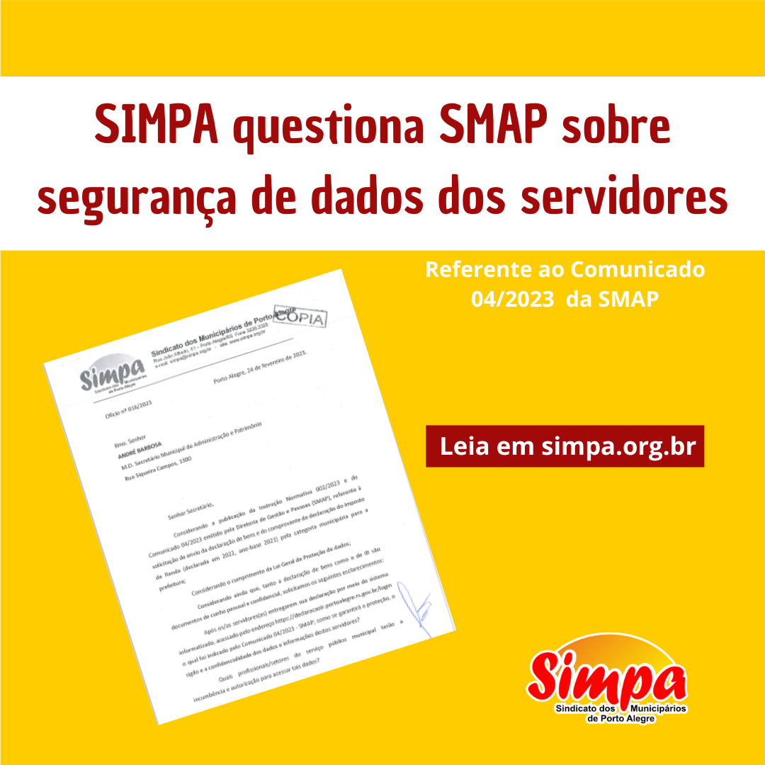 Após tomar conhecimento do Comunicado 04/2023 emitido pela SMAP, o SIMPA enviou ofício para a secretaria solicitando explicações sobre a segurança dos dados de servidoras e servidores que estão sendo exigidos pela prefeitura. Tanto a declaração de imposto de renda, quanto a de bens, são consideradas de cunho pessoal e confidencial. Considerando a Lei Geral […]