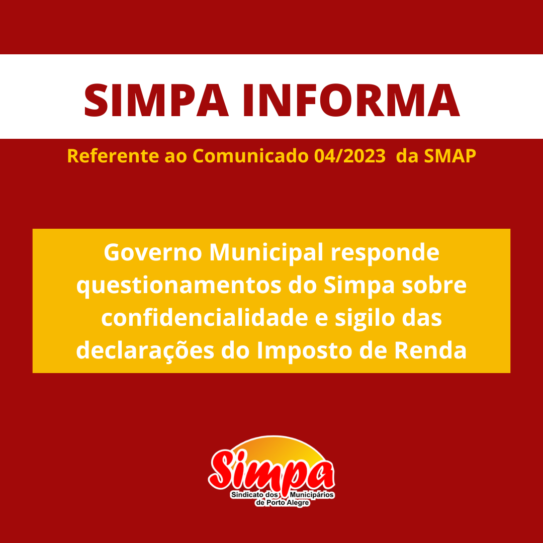 O Sindicato dos Municipários de Porto Alegre (Simpa) recebeu resposta do Governo Municipal sobre os questionamentos que fez referente a segurança, confidencialidade e sigilo dos dados dos servidores em relação ao envio das declarações de Imposto de Renda (IR) ao sistema da Prefeitura Municipal de Porto Alegre (PMPA). Em resposta ao Ofício nº 016/2023 (22476359) […]