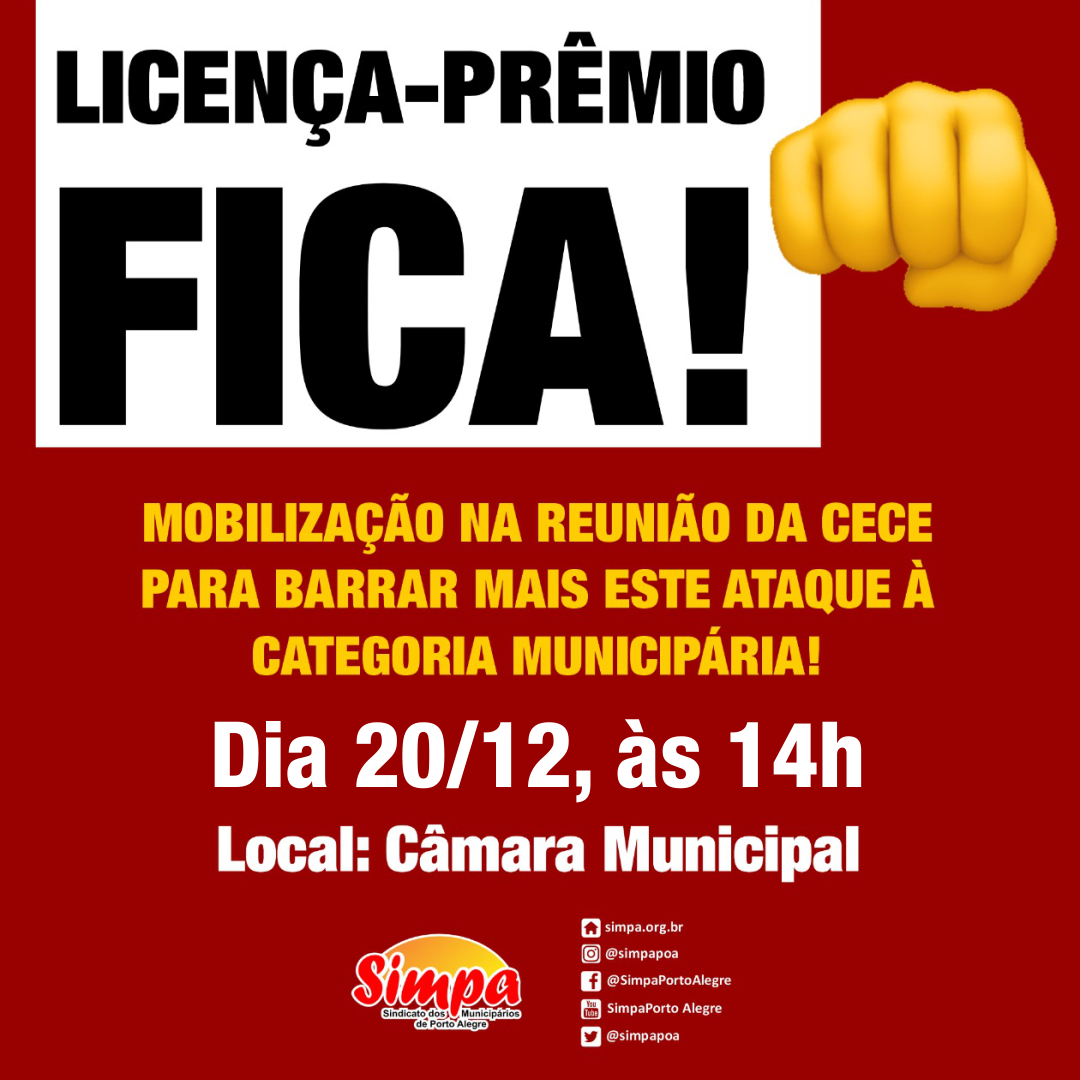 Na luta para barrar a extinção da Licença-prêmio, o Simpa convoca toda a categoria municipária para estar presente na próxima reunião da Cece – Comissão de Educação, Cultura e Esportes da Câmara Municipal de Vereadores, no dia 20/12, às 14h. A reunião, aberta ao público, debaterá o Projeto de Emenda à Lei Orgânica Municipal (PELO) […]