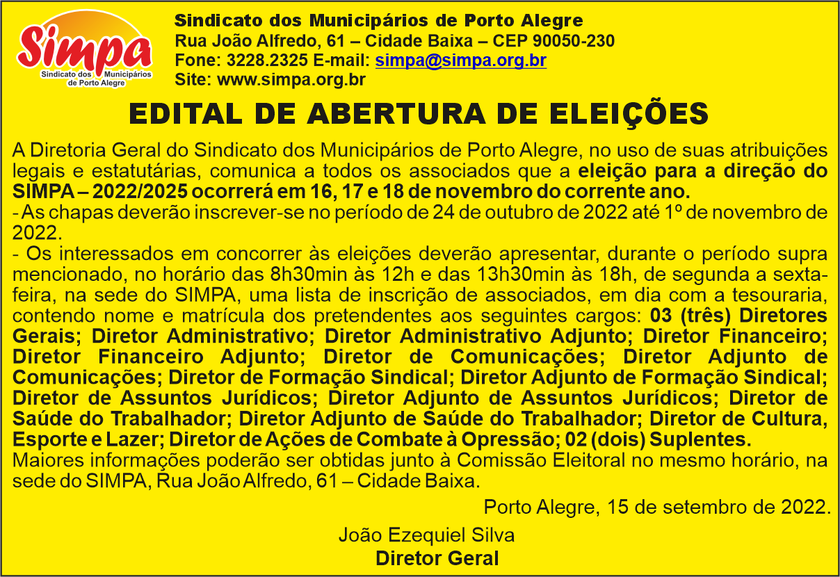 O Simpa informa a nominata da nova diretoria, do Conselho Fiscal e do Conselho Deliberativo do biênio 2022/2024 da Associação dos Assistentes Administrativos da Prefeitura de Porto Alegre – ASAD, após as eleições ocorridas no dia 8/9. NOMINATA DIRETORIA ASAD 2022/2024 Presidente: Elvis 1° Vice-presidente: Rafael de Oliveira 2° Vice-presidente: Daniel Teixeira Canti 1° Secretário: […]