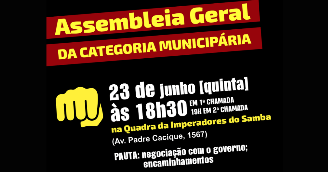 Vamos avaliar a nova proposta do governo e definir os encaminhamentos! Assembleia Geral da Categoria Municipária Dia 23 de junho [quinta-feira] 18h30 em 1ª chamada 19h em 2ª chamada Na quadra da Imperadores do Samba (Av. Padre Cacique, 1567) PAUTA: negociação com o governo e encaminhamentos Acesse o link e conheça a última proposta: https://simpa.org.br/wp-content/uploads/2022/06/PROPOSTA-DO-GOVERNO-13-JUNHO.pdf […]