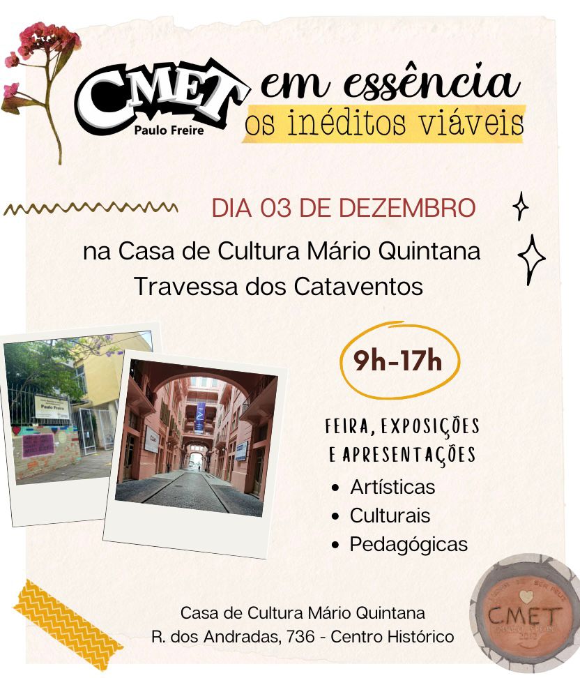 O evento de final de ano acontece neste sábado na Travessa dos Cataventos, na Casa de Cultura Mário Quintana No próximo sábado, 3, acontece a mostra encerramento do ano letivo do Centro Municipal de Educação dos Trabalhadores Paulo Freire, única escola pública especializada na oferta de EJA de ensino fundamental que atende nos turnos […]