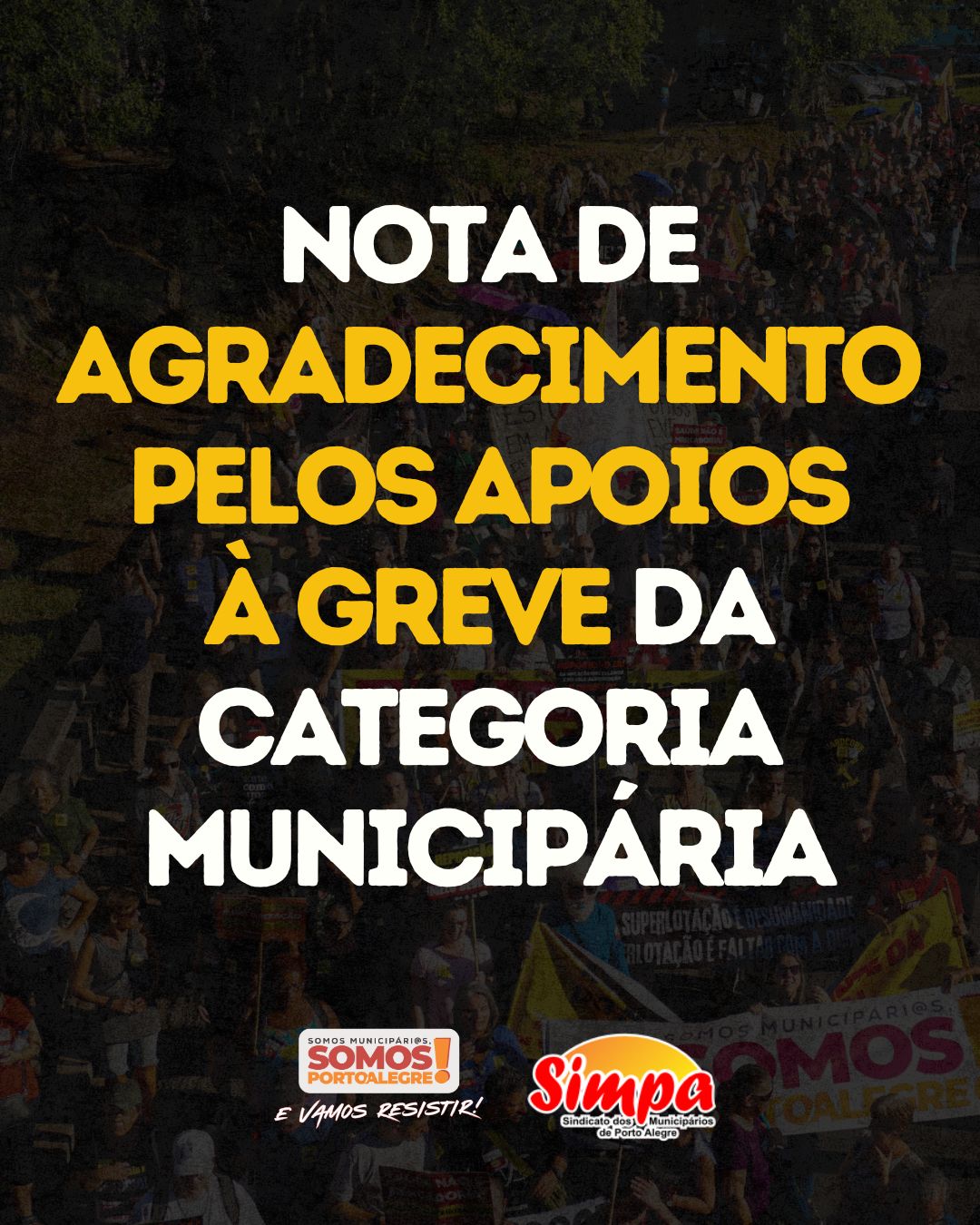O Sindicato dos Municipários de Porto Alegre (SIMPA) agradece publicamente a todos os sindicatos, centrais sindicais, organizações e parlamentares que manifestaram apoio à greve da categoria municipária. A solidariedade recebida fortalece nossa luta por direitos, dignidade e melhores condições de trabalho para os servidores e servidoras que constroem diariamente os serviços públicos da nossa cidade. […]