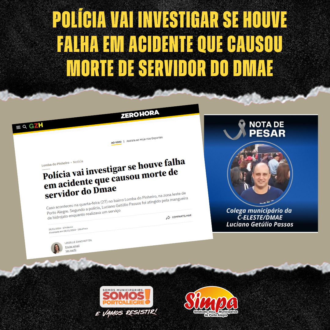O SIMPA-CORES DMAE informa com pesar o falecimento de LUCIANO GETÚLIO PASSOS, colega municipário da C-ELESTE, na tarde desta quarta-feira (27/11), vítima de um trágico acidente de trabalho. Luciano era um batalhador pelo DMAE e colega querido por todos! Exigimos que a Direção Geral do DMAE tome todas as medidas necessárias para investigar […]