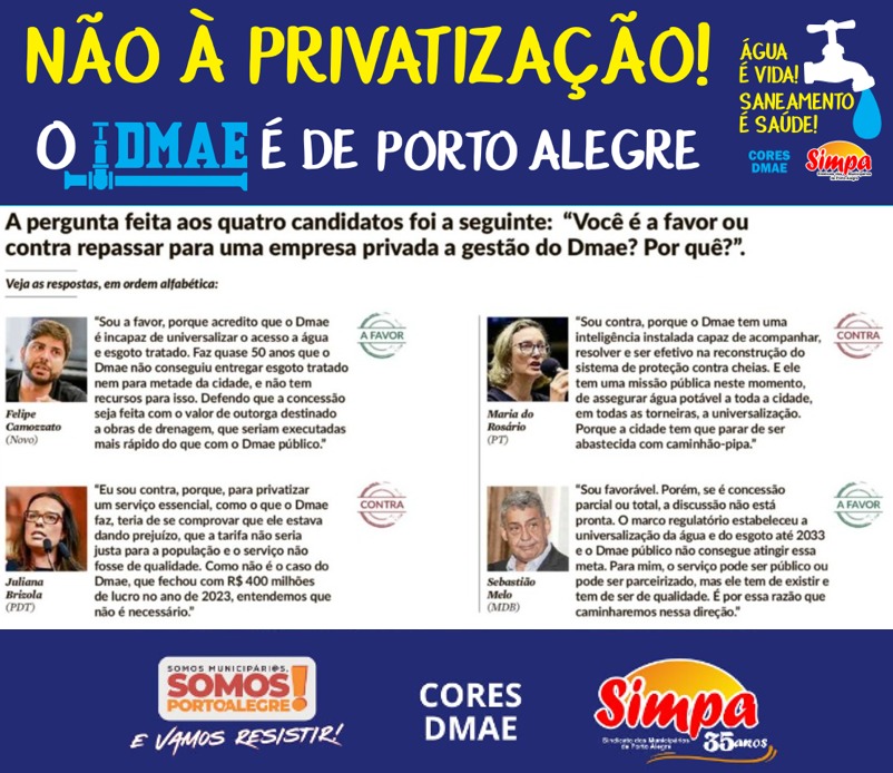 Foi divulgada pesquisa feita a 4 candidatos a prefeitura de Porto Alegre onde responderam a seguinte pergunta: “Você é a favor ou contra repassar para uma empresa privada a gestão do DMAE? Por quê?” Entre as respostas, 2 candidatos afirmaram que privatizariam o DMAE e 2 responderam que são contra. Importante divulgar entre os colegas do […]