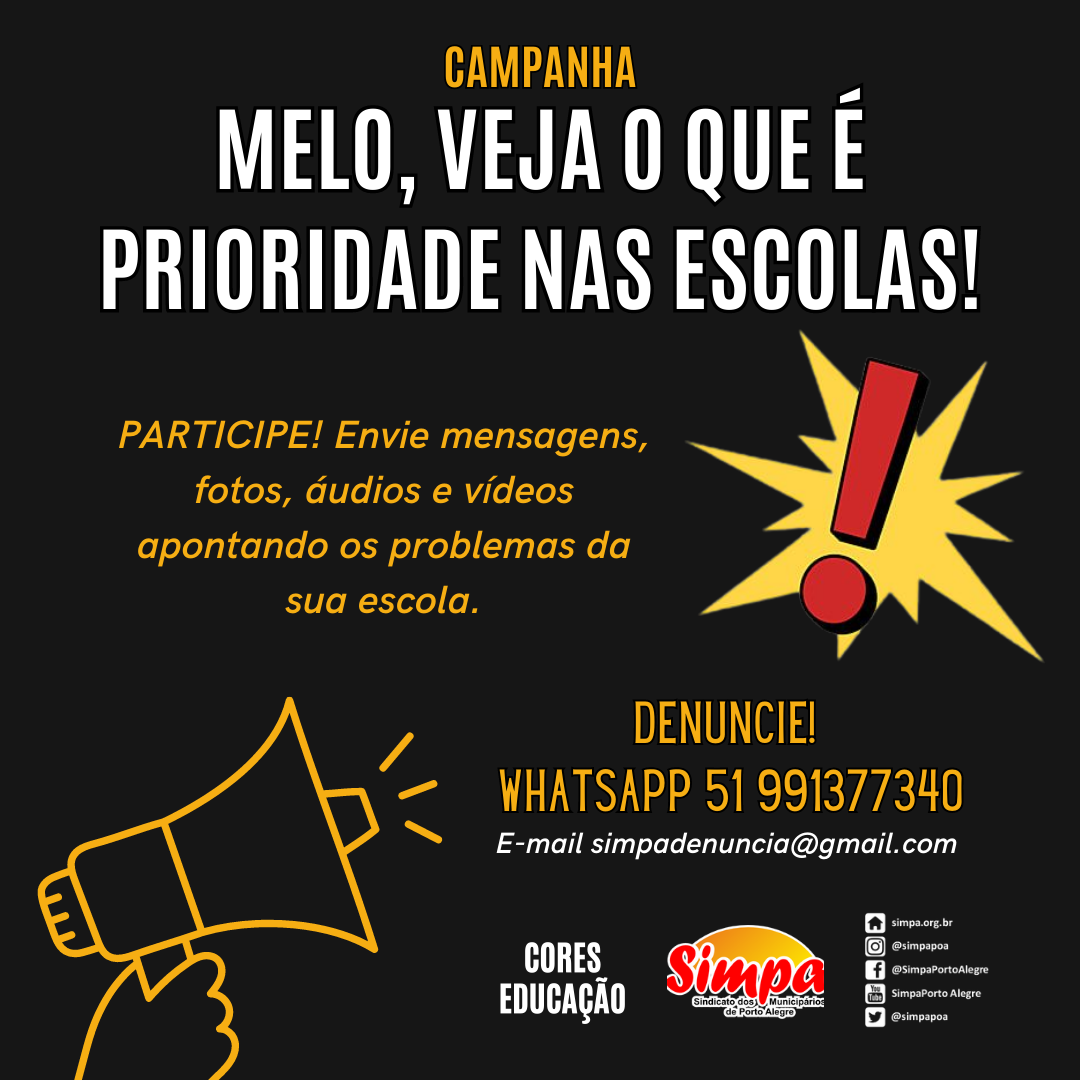 O Sindicato dos Municipários de Porto Alegre (Simpa) lançou vídeo da campanha “Melo veja o que é prioridade nas escolas”, em função da crise na Secretaria Municipal de Educação (SMED). O discurso do prefeito não condiz com a prática e as propagandas do seu governo são diferentes da realidade. A maioria das escolas da rede […]