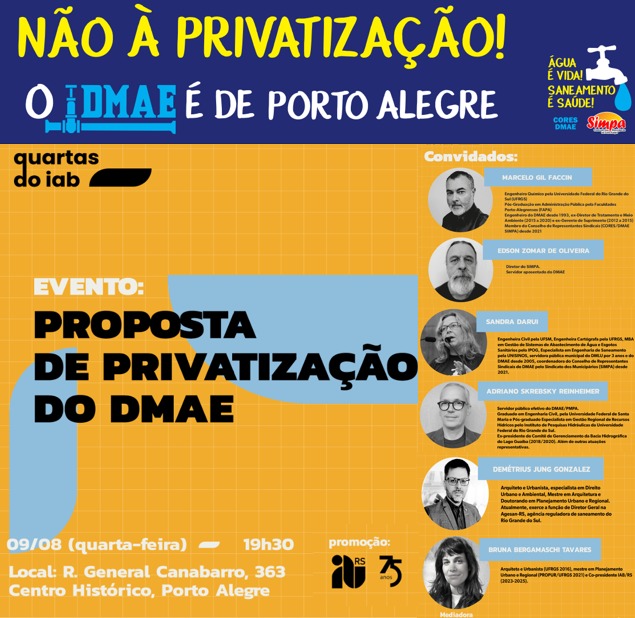 Na próxima quarta-feira, 9 de agosto, acontecerá no Instituto de Arquitetos do Brasil um debate em formato de mesa redonda sobre a proposta de privatização do DMAE e seus impactos urbanos e sociais. Para debater o assunto, foram convidados o diretor geral da AGESAN-RS, Demétrius Jung Gonzalez, o engenheiro químico e membro do Conselho de […]