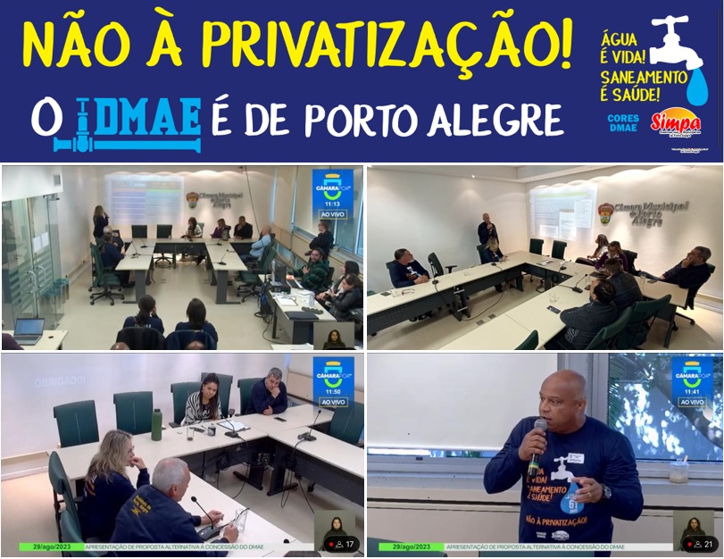 Nesta terça feira, 29/08, o SIMPA CORES – DMAE participou da reunião da Comissão de Urbanização, Transportes e Habitação (CUTHAB) da Câmara Municipal de Porto Alegre para apresentar o contraponto de caráter técnico à proposta de privatização/concessão/parceirização que está sendo conduzida pela atual administração municipal. A reunião foi proposta e presidida pela vereadora Karen Santos […]