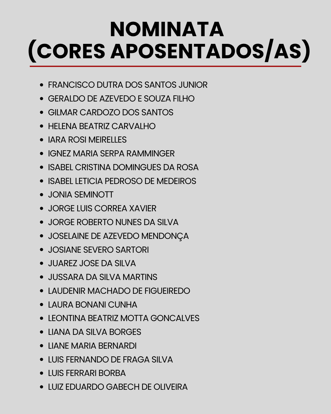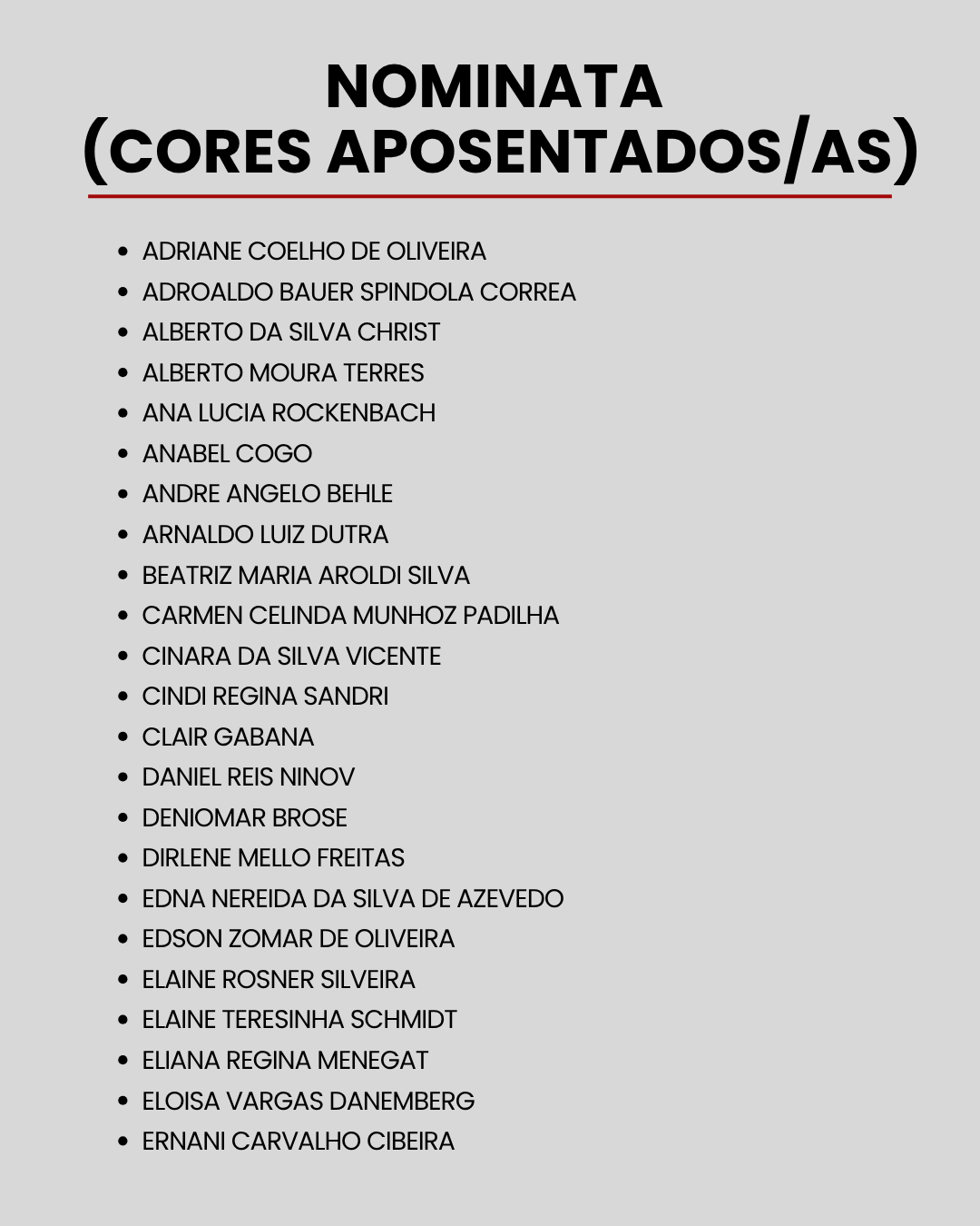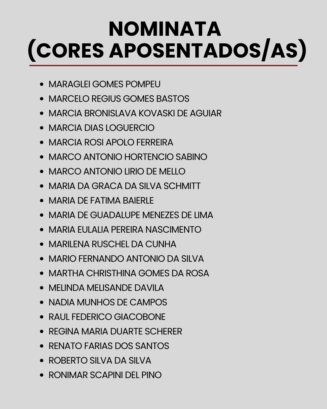 Em atenção aos dispositivos do Regimento Eleitoral, especialmente aos artigos 5º e 8º, e após o recebimento das inscrições pelo endereço eletrônico específico coressimpa2026@gmail.com, a Comissão Eleitoral torna pública a relação das candidatas e candidatos homologados, em ordem alfabética, que concorrerão a 44 vagas no CORES APOSENTADOS/AS.