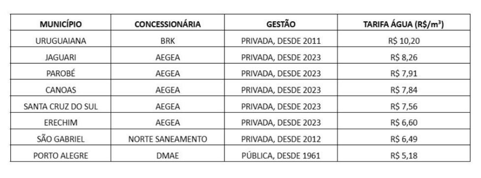 Diante disso, ao confrontar as tarifas das concessionárias privadas com a gestão pública e estatal do Dmae de Porto Alegre, tem-se que, em Uruguaiana, o custo da água da gestão privada da BRK, é 96,91% superior ao da água do Dmae; respectivamente, em Jaguari, da gestão privada da Aegea/Corsan é 59,46% superior ao da água do DMAE; em Parobé, da gestão privada da Aegea/Corsan, é 52,70% superior ao da água do Dmae; em Canoas, da gestão privada da Aegea/Corsan, é 51,35% superior ao da água do Dmae; em Santa Cruz do Sul, da gestão privada da Aegea/Corsan, é 45,95% superior ao do Dmae; em Erechim, da gestão privada da Aegea/Corsan, é 27,41% superior ao da água do Dmae; e em São Gabriel, da gestão privada da Norte Saneamento, é 25,29% superior ao da água do Dmae.