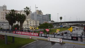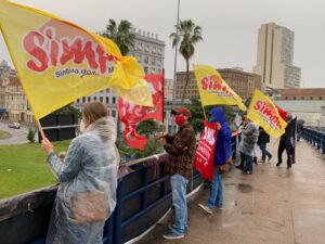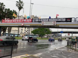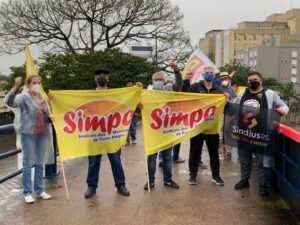 O Simpa, juntamente com representantes de outros sindicatos de servidores públicos e de centrais sindicais, participou de ato contra a PEC 32 (reforma administrativa), realizada no fim da tarde desta terça-feira (28). O ato ocorreu sobre a passarela ao lado da rodoviária, no centro Porto Alegre. No local, foi colocada faixa com as mensagens “Deputado que votar na PEC 32 não volta” e “Não à reforma administrativa”.